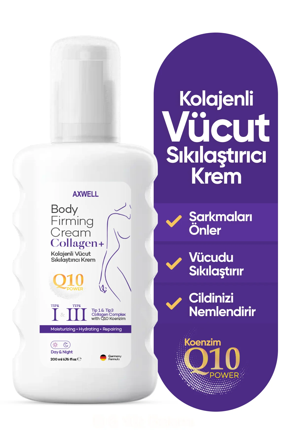 AXWELL Body Firming Cream, özel formülasyonuyla cildinizi sıkılaştırırken aynı zamanda nemlendirir ve daha sıkı, daha yumuşak ve pürüzsüz bir cilt görünümü sağlar. Q10 gücü, tip1 ve tip2 kolajen içeriğiyle cildinizi besler ve gençleştirir.