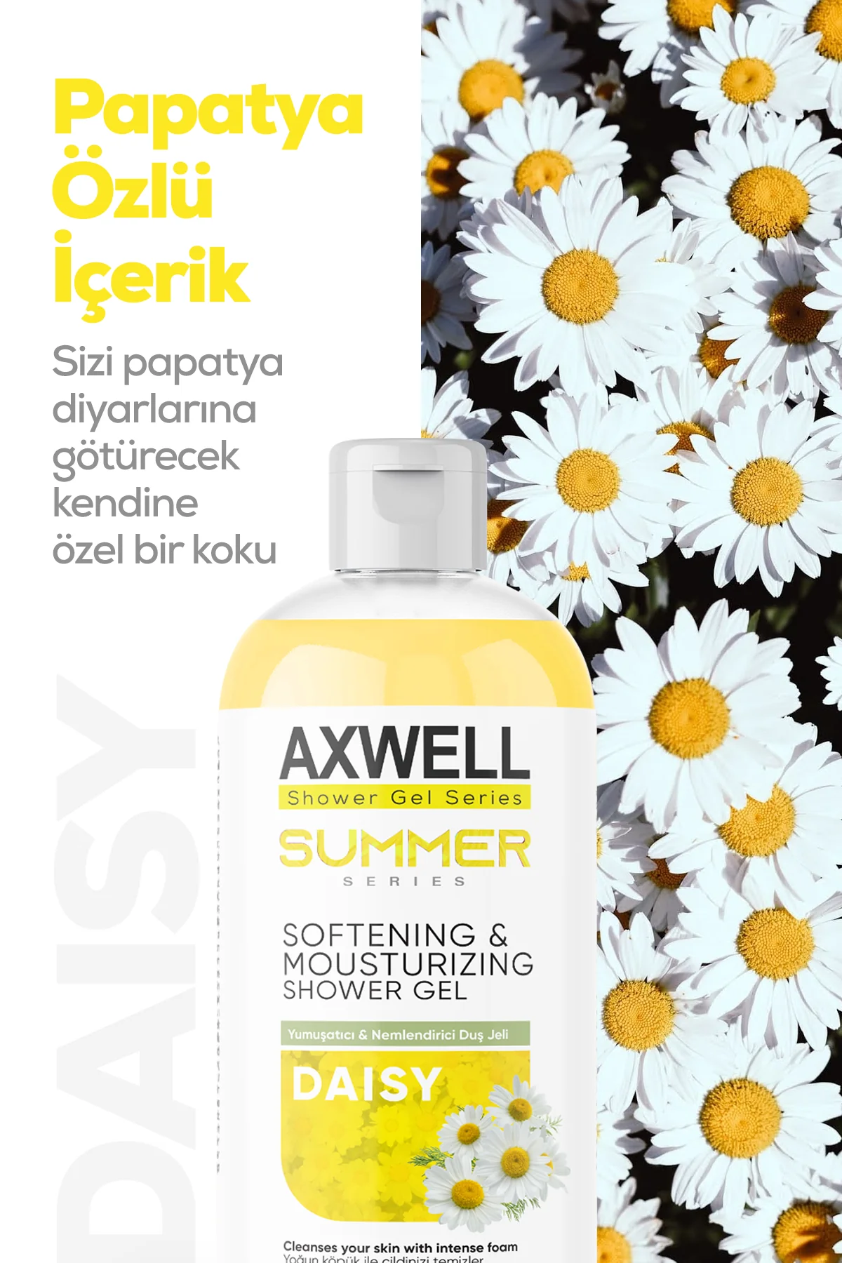 Axwell Papatya & Daisy Duş Jeli, cildinizi nazikçe temizlerken doğadan ilham alan yatıştırıcı kokusuyla sizi ferahlatır. Papatya ve daisy (papatya çiçeği) özleriyle zenginleştirilmiş özel formülü, cildinize ipeksi bir yumuşaklık kazandırır ve duş almayı bir keyfe dönüştürür.