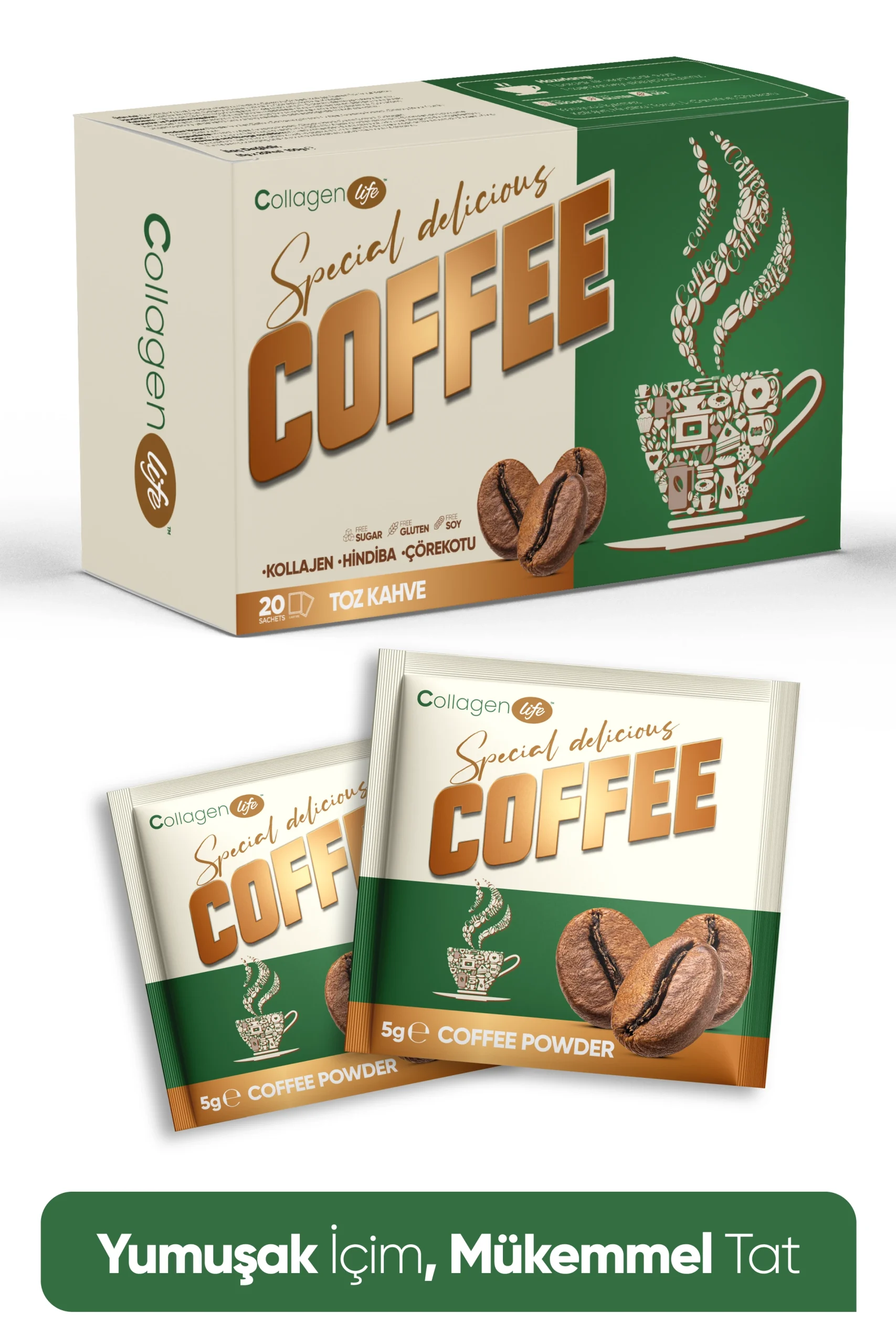 CollagenLife Kolajen Special Coffee, cilt güzelliğini desteklerken kilo kontrolüne ve detoks sürecine yardımcı olmak için özel olarak formüle edilmiş bir kahve karışımıdır. Doğal kahve ve zayıflamaya destek sağlayan içerikleri bir araya getirerek hem metabolizmayı hızlandırır hem de günlük enerji ihtiyacınızı karşılar. 20 saşelik pratik paketleriyle her yerde kolayca kullanabilirsiniz.