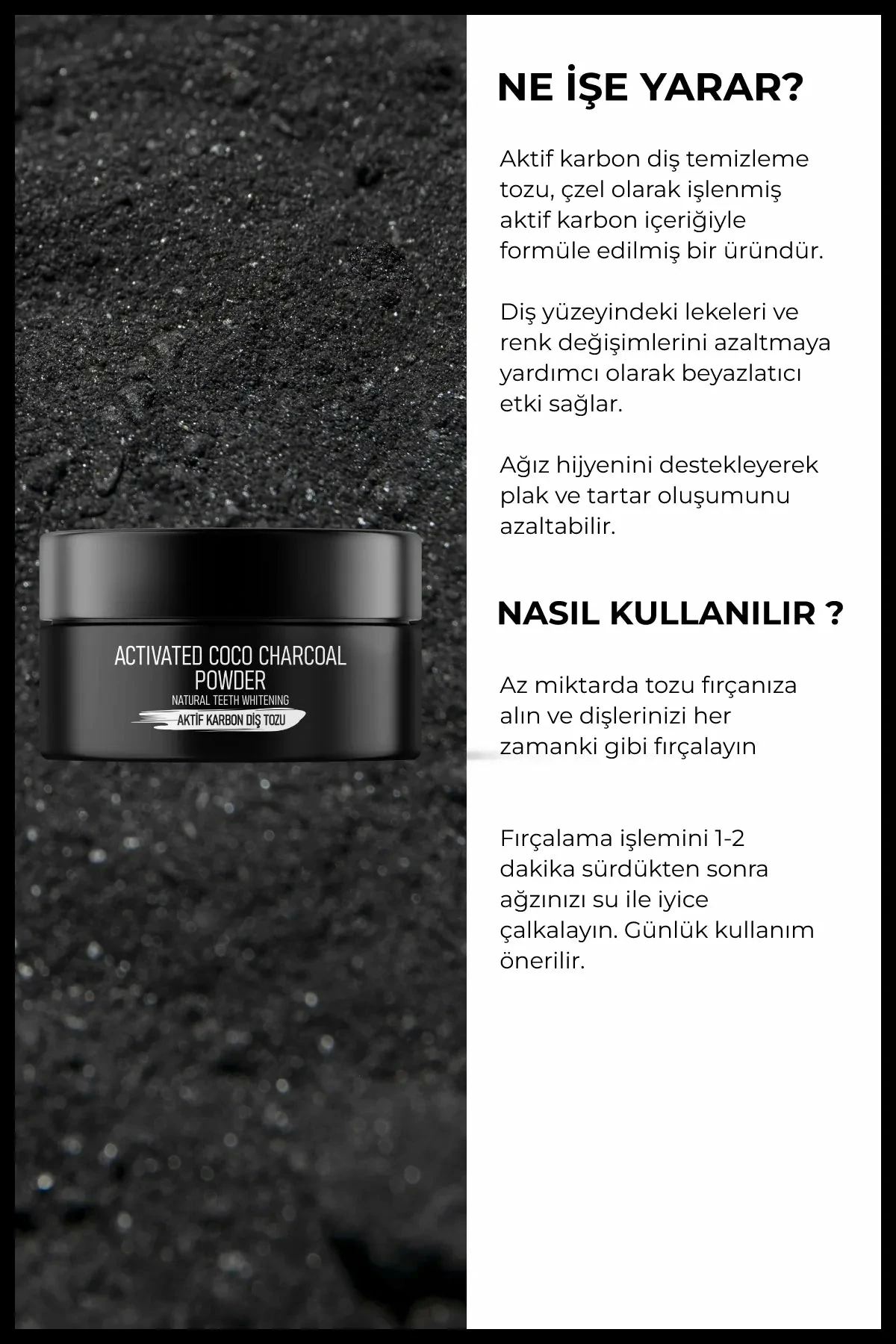 İÇİNDEKİLER / INGREDIENTS (INCI): SODIUM BICARBONATE, CALCIUM CARBONATE, BENTONITE, CHARCOAL POWDER, SORBITOL, MICROCRYSTALLINE CELLULOSE, CURCUMA LONGA ROOT EXTRACT, SALVIA TRILOBA LEAF EXTRACT.